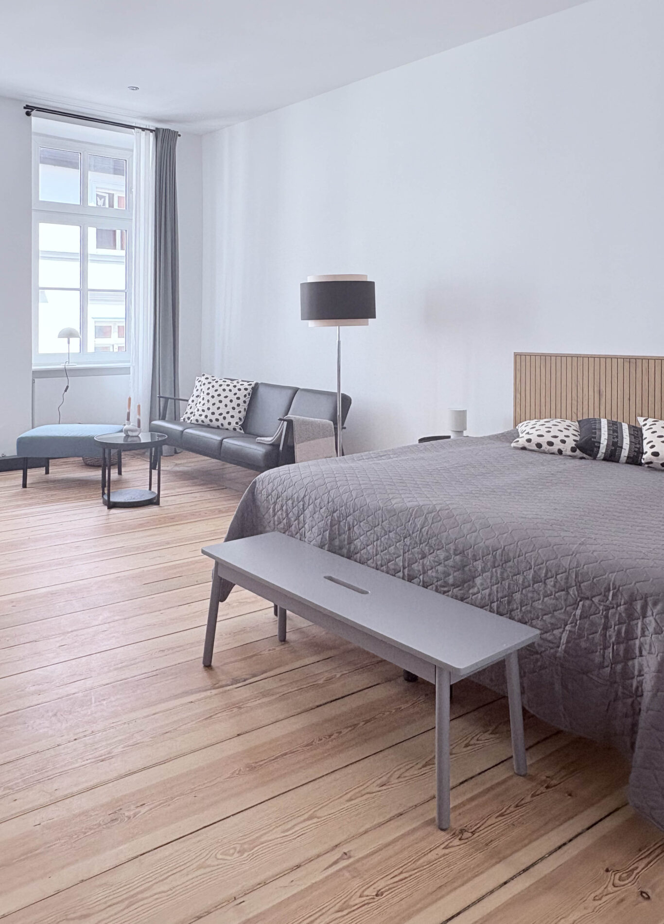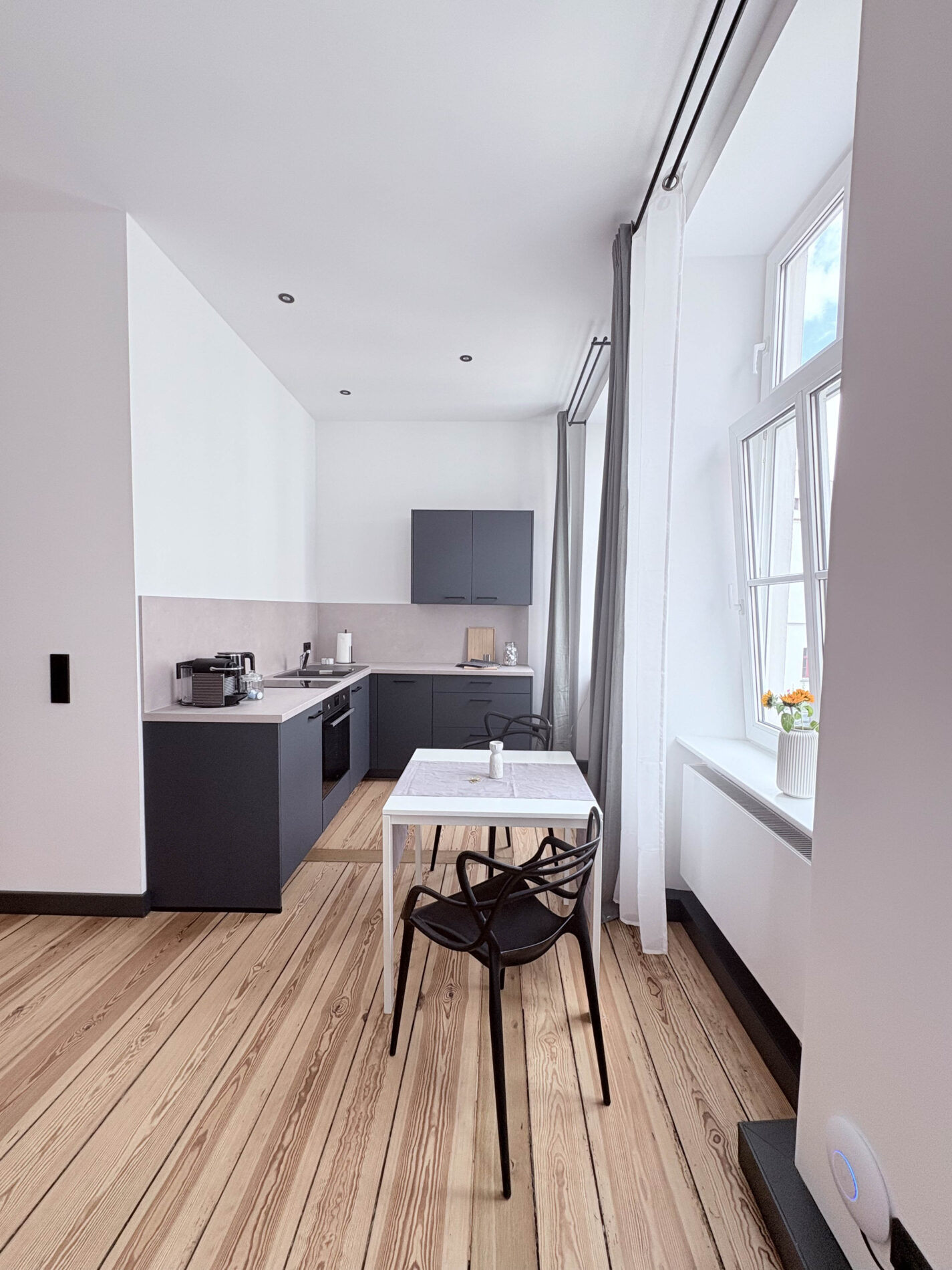 Willkommen in deinem frisch sanierten 1-Zimmer-Studio in der historischen Altstadt von Stralsund – ideal für Paare und Kurzurlauber! Das moderne Apartment bietet auf 31 m² einen hellen, offen gestalteten Raum mit einem komfortablen Doppelbett (180 cm), einer voll ausgestatteten Küche und einem hochwertigen Bad mit bodengleicher Dusche.